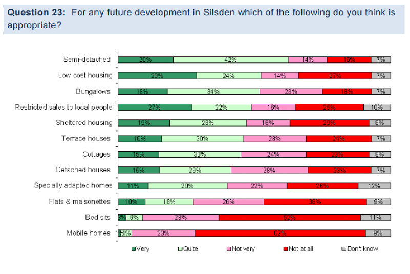 The following graphic is taken from the Silsden 2012 Survey. 1102 people completed the questionnaire (so a good proportion of the population / families of Silsden) - we would like low cost semi detached houses for local people. What are we getting? 4 and 5 bed expensive houses for families who will be working in Leeds. ![]() MORE INFORMATION 2012survey.silsden.net/ 2012survey.silsden.net/wp-content/uploads/2012/07/2012_Silsden_Survey_Results-published2014.pdf |