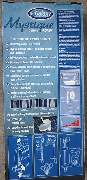 this post has been edited 1 time(s) It should be installed by a qualified electrician. It is the equivalent to 3 electric kettles, what you need if you want a fairly powerful hot shower rather than a pathetic cold dribble. It would need the same sort of electrical installation as a cooker.... I think, but I'm not an electrician. Just read the information on the box... The shower should be permanently connected to the electricity supply through a double pole linked switch with a minimum break capacity of 40 amp. Cable size - 6mm^2 (for most installations). For some it may be necessary to use 10mm^2 cable. |