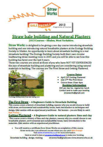 Straw Works is delighted to be giving a one day course introducing strawbale building and one introducing natural breathable plasters at the Ecology Building Society in Silsden ![]() More details..... silsden.net/forum/docs/KeighleyCourses_strawbale.pdf |