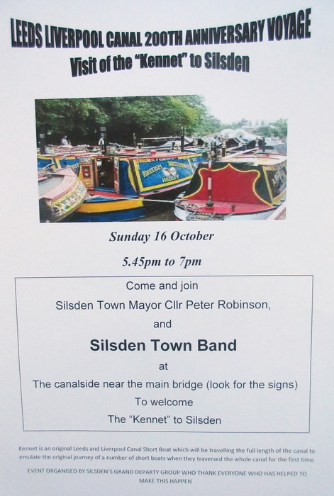 To mark 200 years since the opening of the Leeds Liverpool canal, the historic boat 'Kennet', is embarking on a 9 day journey along the full length of the Canal. 'Kennet', a Leeds Liverpool canal short boat, will arrive in Silsden (with its accompanying flotilla) on the evening of Sunday 16 October at the end of day 2 of its commemorative journey. A special welcome event will take place at the old wharf near the main canal bridge in Silsden between 5.45pm and 7pm on the evening of Sunday 16 October, when Silsden Town Band will play and our Mayor will be there to receive our special visitor. Everyone is invited to come along to join in the welcome. |