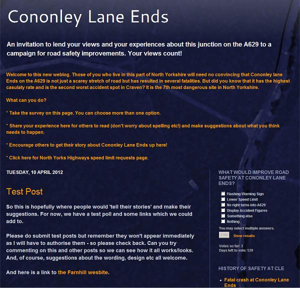 Posted on behalf of Gail who would like your help. Those of you who live in this part of North Yorkshire will need no convincing that Cononley lane Ends on the A629 is not just a scarey stretch of road but has resulted in several fatalities. But did you know that it has the highest casulaty rate and is the second worst accident spot in Craven? It is the 7th most dangerous site in North Yorkshire. ![]() clearview629.blogspot.co.uk/ To contribute to this blog, visit: www.blogger.com/i.g?inviteID=3519720182564232910&blogID=4044233151928334402 |