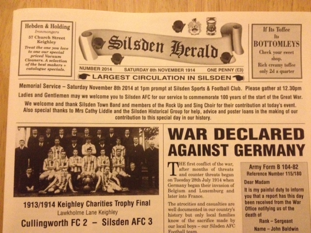 Silsden AFC are holding a Service of Remembrance and Celebration on Saturday 8th November 2014 at the ground. We want to commemorate the bravery of all the sportsmen and local residents who went to fight in the Great War, some never to return. Starting at 1.00 the service will last about 1 hour and will have Silsden Town Band accompanied by the Rock Up and Sing Choir playing and singing songs from the era with audience participation. Opening words from, our football club Chairman, 3 church leaders, Silsden`s Royal British Legion and the service will be closed with words from our sports club Chairman. Light refreshments and the Silsden Historical war exhibition will be on display in the sports club. Anyone staying for the game at 3.00 will see the two team captains jointly placing a wreath against the match day ball, followed by one minutes silence. We have produced a special newspaper priced at £3, which will be on sale in shops soon with stories and facts from the 1900s to the present day. The service is open to all but could you please let us know if you wish to attend on Silsdenafc@hotmail.com so we can plan the day. All profits of the newspaper and the service will go to the Silsden Poppy Appeal. Our opposition could bring over 100 supporters so we will open the car park at the old Belmont Silks factory and get as many as we can there, and in our ground, so your patience is asked for. |