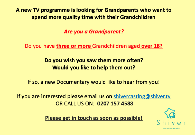 DON'T FORGET THE SUBJECT IS >>>>>>>> Forums Home > EVENTS - ANNOUNCEMENTS - MEETINGS > Grandparents and Grandchildren - required for documentary |