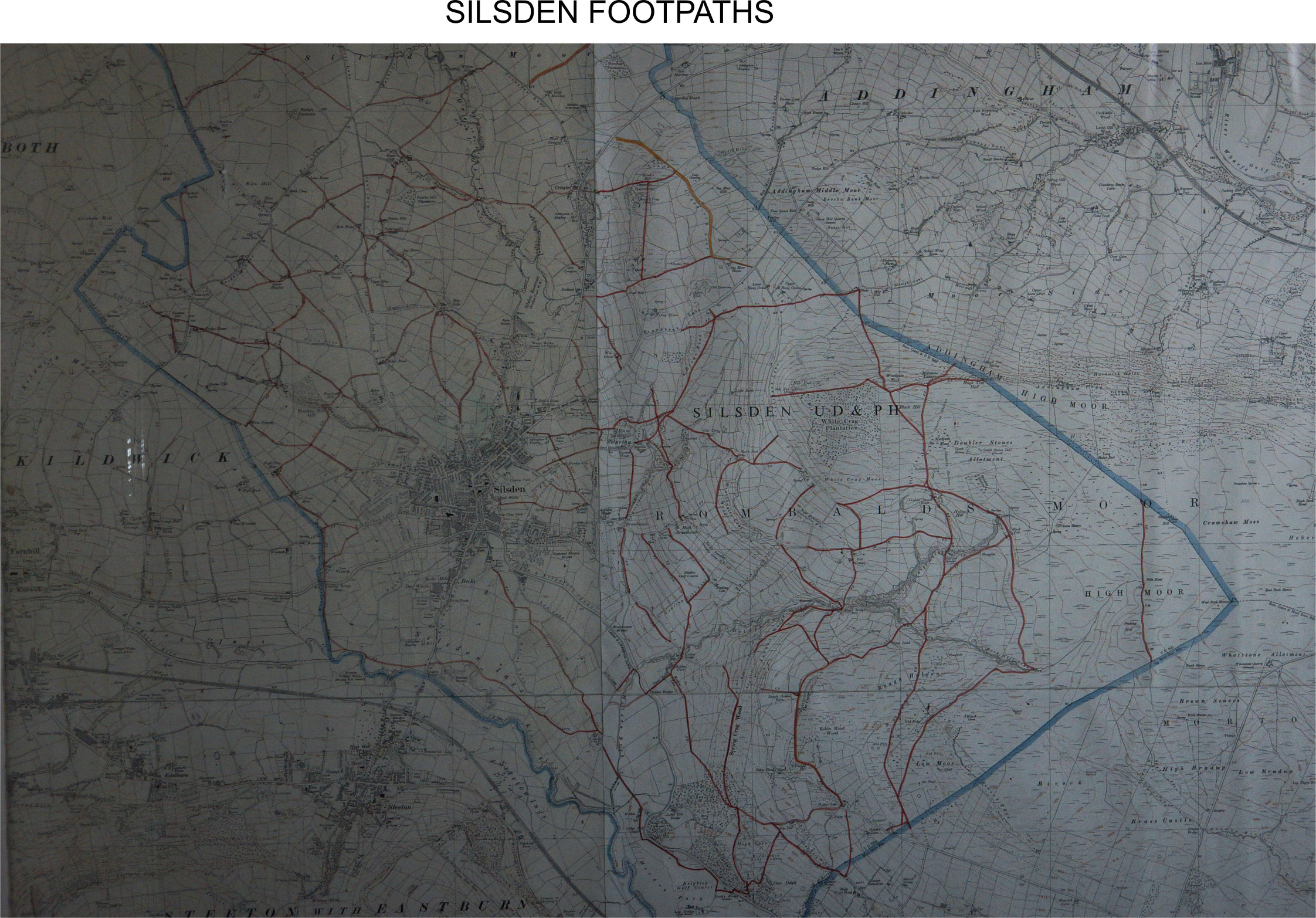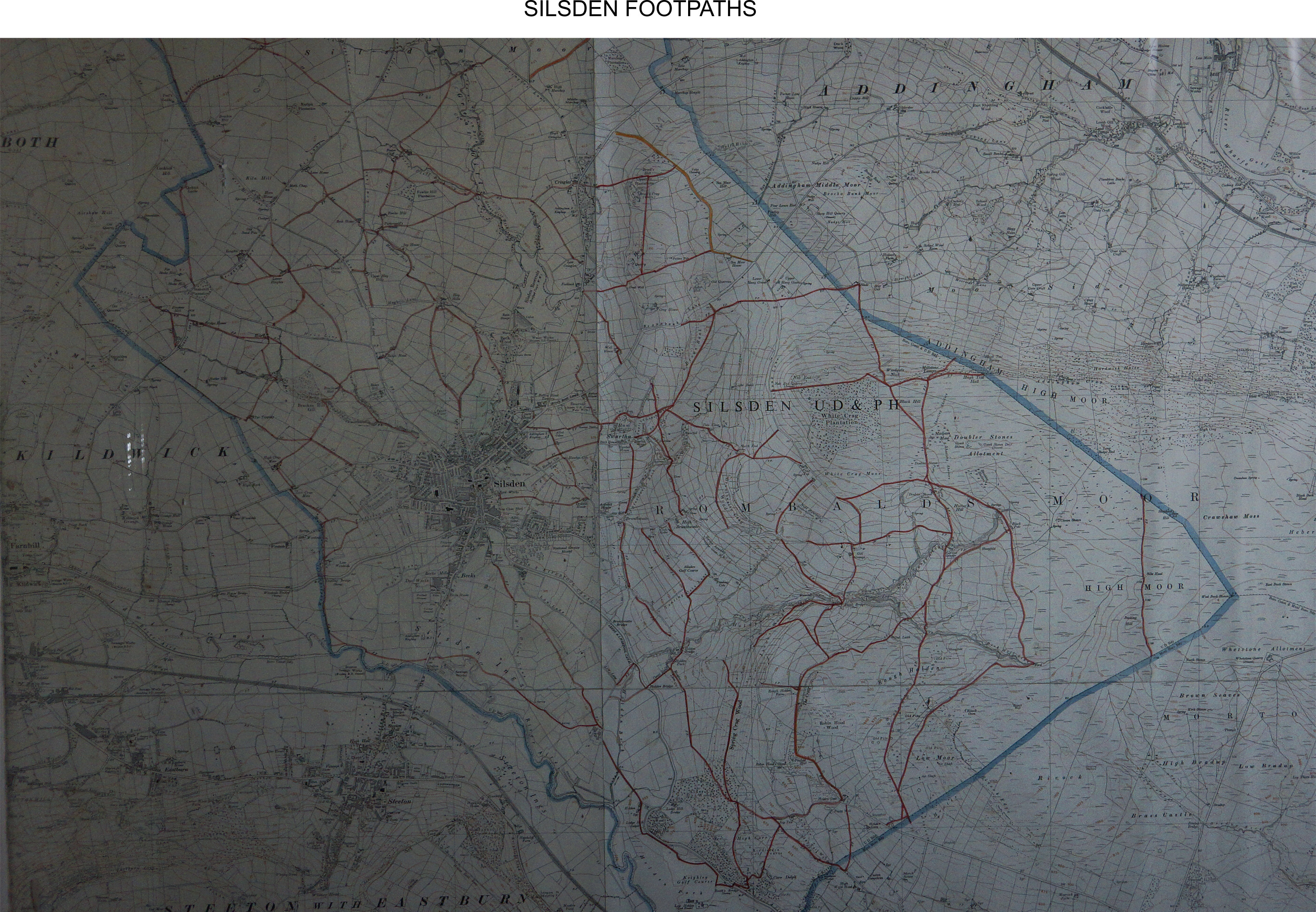 The links below are of the definitive map of footpaths for the Silsden area. The map used to hang in the Council Chambers in the Town Hall before the refurbishment but before the map was removed I took some pictures. The quality is not the best because the map was behind glass and the room was very badly lit. I have made copies of the map for you to download. ALL the links below are of the same map but saved at different sizes ie A3, A2 and A1 A3 (531Kb) news.silsden.net/wp-content/uploads/2014/10/silsden_footpaths.jpg A2 (992Kb) news.silsden.net/wp-content/uploads/2014/10/silsden_footpaths_2.jpg A1 (2.02Mb) news.silsden.net/wp-content/uploads/2014/10/silsden_footpaths_3.jpg |