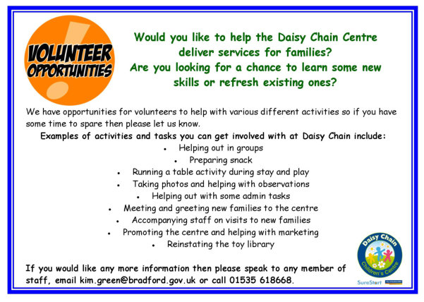 DON'T FORGET THE SUBJECT IS >>>>>>>> Forums Home > LOCAL JOB OPPORTUNITIES > Volunteer Opportunities at the Daisy Chain Centre |