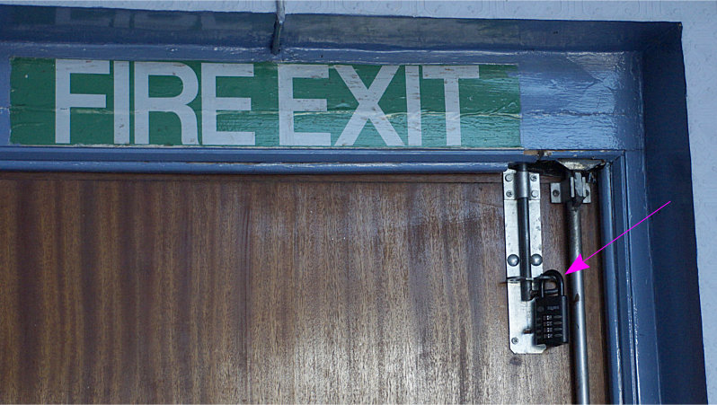 I wonder how many people hiring a room at the town hall have realised that they are liable for fire exits, I bet most people don't even read through the conditions of hire and just sign the form and pay the money! could the lock combination not be written on a notice in large letters next to the exit? I am still amazed that a fire exit is allowed to be locked |