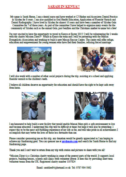 I'm very excited to have the opportunity to travel to Kenya at Easter 2015! I will be volunteering for 2 weeks with the charity Mission Direct. While in Kenya the team and I will be partnering with the Maasai Evangelistic Association and working to build a new Massai Rescue Centre. The centre will offer refuge, education and empowerment for young women who have fled their families, refusing forced marriage. I will also work with a number of other social projects during the trip; assisting at a school and applying fluoride varnish to the children's teeth. Please consider sponsoring me on this trip, any donation would be greatly appreciated as I am hoping to achieve my fundraising goal. Thank you, and I can't wait to return from my trip with stories and pictures to share with you all! TO SPONSOR ME mydonate.bt.com/fundraisers/sarahhorne1 Thank you, Sarah Horne ![]() MORE INFO news.silsden.net/wp-content/uploads/2014/11/My-name-is-Sarah-Horne.pdf |