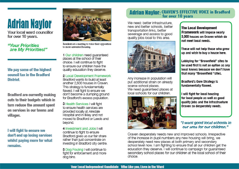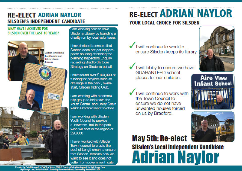 quotePeter you have every right to a personal political position and loyalty but what can you mean by the Cllr Naylor stuff being the "only information available so far". Is it that he's the only candidate who has provided you with a glossy leaflet to publish just out of the goodness of your neutral web master heart? Have you offered the other candidates the same service and have they spurned your help? Dear me! Do hope no one thinks Silsden.net would be better named Naylor.Met Peter has always put up all the candidates leaflets so are you really blaming him because the other candidates have not put out leaflets or are you saying he should not illustrate the leaflet(s) that candidates have put out? |