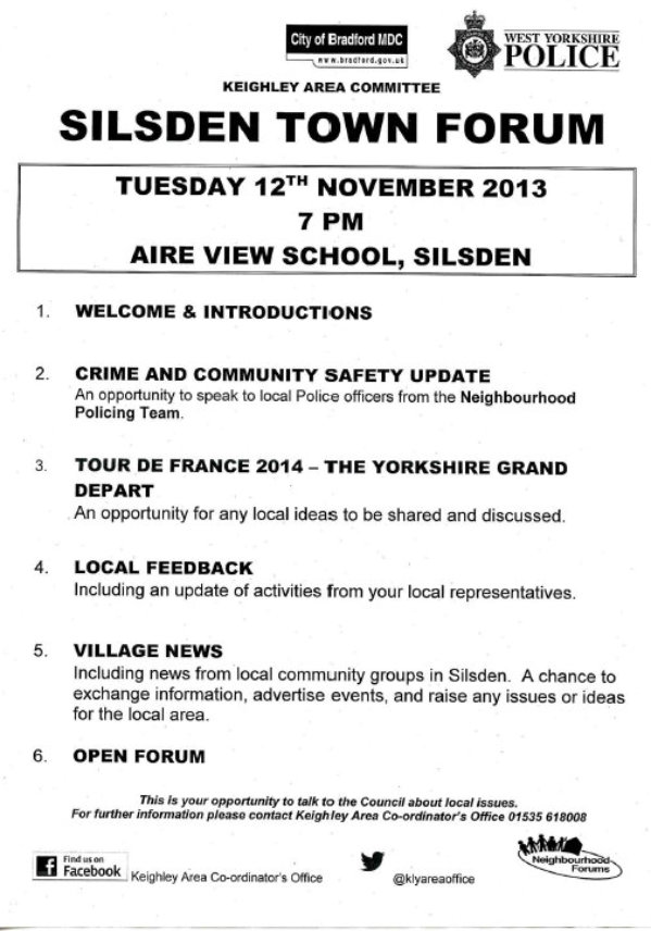 How many people have had the letter from BMDC regarding the Silsden Town Forum meeting on Tuesday 12th November at Aireview School at 7pm. We received this letter last week. I have spoken to a few people about it, but not one person had received this letter. |