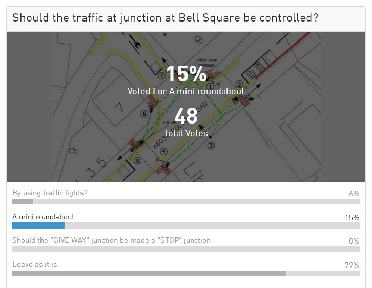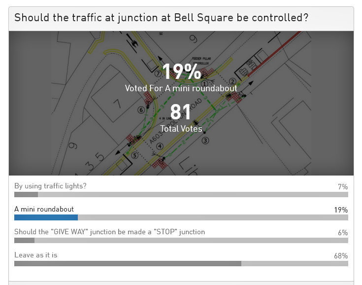 I note that in the poll, 79% of people vote to leave things as they are, 15% vote for a roundabout, and 6% vote for traffic lights. We can be surely reassured that our councillors will abide by this democratic vote. ????? |