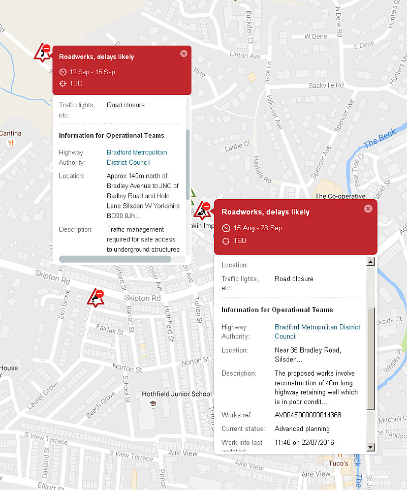 ![]() Looks like the residents of Bradley Road will have a bit of a problem going anywhere in August/September On the Keighley Road planned roadworks - Bradford have woken up to the fact that two lots of traffic lights have been authorised on the same part of Keighley Road, at the same time. There will now only be one set of traffic lights so the work on the beck wall and the surface water drain from the Harren Homes Sykes Lane) development will be carried out sequentially (oh joy we will have to put up with this situation for even longer). The last time I looked the information on the timing of the road works had changed yet again and it will now last longer - surprise, surprise! This is the Cringles wall lot we are talking about and we will soon be into the flood period, so I can only see workmen waiting out the rain in their portacabin watching the traffic lights change (oblivious, of course, to the traffic queuing on the dual carriageway and halfway up Cringles. These people have still not met with our town council. If you want to check the situation for yourselves this is the link roadworks.org/ |